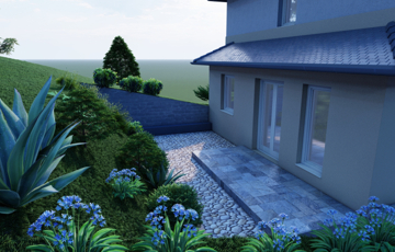 A bejárati ajtó előtt járda az utca frontig viacolor burkolat.