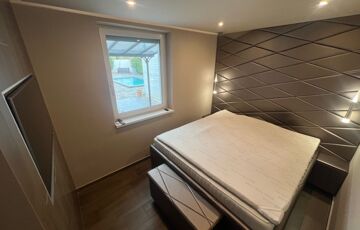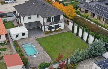 Kiemelkedően igényes környezetben, 61 m²-es, 2 szoba + nappalis lakás eladó, 350 m² saját kerttel, 25 m² terasszal, medencével, 20 m²-es kerti faházzal és 2 gépkocsibeállóval.
