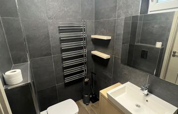 A lakás nagy gondossággal és kivételes harmóniával épült – mind a belső tér, mind a kert tökéletes összhangban van.