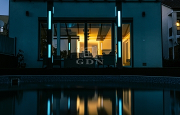 a merevfalú medence, a teraszos, burkolt kerti falak és a finoman megtervezett világítás egy olyan privát teret hoznak létre, amely nem hivalkodik, mégis egyértelműen prémium.