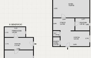 A II. generáció 24 m2-es, itt szoba, konyha és fürdőszoba került kialakításra, a fűtés gázkonvektorral megoldott. Ez a rész kívülről 10 cm-es hungarocell szigetelést kapott, a tető újszerű és kőzet gyapottal szigetelt a padlás.