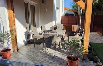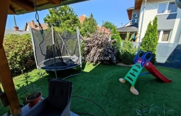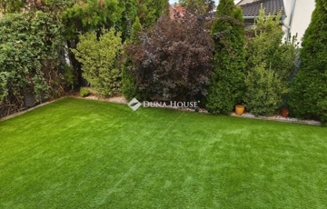 Az ingatlanhoz tartozik egy 250m-es kert, mely prémium minőségű műfűvel borított így igen alacsony fenntartási költséget von maga után. Az udvar méretéből adódóan kiválóan alkalmas baráti és családi összejövetelekre, ahol nyugodtan kihasználhatjuk a környék adta nyugalmat. A szomszédság kedves és csendes, mely elengedhetetlen egy nyugodt Életvitelhez, jó lakóközösség jellemzi a környéket.