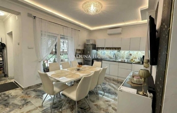 A lakótér praktikus elrendezésű: a 12 m2-es fedett teraszról jutunk be az előtérbe, innen nyílik a külön WC, egy kisebb szoba, valamint a modern, gépesített konyhabútorral felszerelt étkező. A napfényes, délkeleti tájolású nappali igazi központja a háznak, ahol kandalló, elegáns márvány TV-fal és falba épített LED világítás teremti meg az otthonos hangulatot. A hálószobából akadálymentesen egy zuhanyzós WC is kialakításra került.