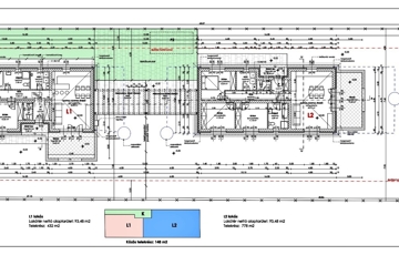 A két épület pergolával fedett kocsibeállókkal kapcsolódik, mindkét telekrész kerítéssel leválasztható. 148 m2-es közös bejáró biztosítja a kocsibeállókhoz történő bejutást.