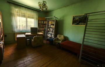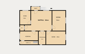 A ház mellett elhaladva érkezünk az előtérbe, ahonnan belépve a tágas, világos nappali fogad, ez a ház központi tere, ahonnan az összes többi helyiség nyílik: a két nagyobb, utcára néző szoba, a fürdőszoba, a konyha, egy külön wc, és a kisebbik szoba.A konyhához egy kamra is tartozik, innen lehet feljutni az egész épület fölött elterülő padlásra.