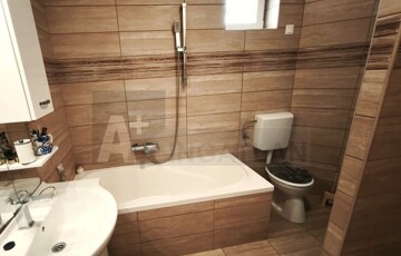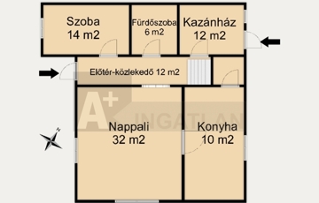Földszint: konyha, nappali + 1 szoba, kádas fürdőszoba wc-vel, kazánház