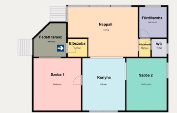 Az ingatlanban kialakításra került egy amerikai konyhás nappali, 2 szoba, fürdőszoba káddal, WC, valamint a bejárat előtt egy 7 m2-es fedett terasz.