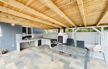 - nagy terasz fedett sütögető résszel és kemencével