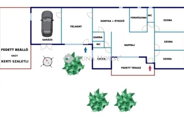 Helyiségek:tágas nappali, 4 külön nyíló szoba, térben szeparált konyha, kamra (spájz) nagyméretű, zuhanyzós fürdőszoba, 2 külön WC (egy kézmosóval a dolgozószoba mellett), télikert, fedett és nyitott terasz