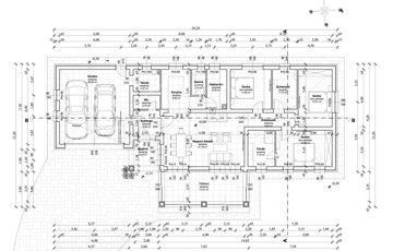Az otthon központi tere egy tágas, étkezős nappali, amely külön konyhával kapcsolódik, így egyszerre biztosít reprezentatív közösségi teret és praktikus, szeparált főzési lehetőséget. A konyhához közvetlenül kapcsolódik egy háztartási helyiség és kamra, amely a mindennapi működést teszi zavartalanná és rendezetté. Az előtérben szélfogó került kialakításra, továbbá egy külön vendégtoalett is rendelkezésre áll a kényelmes fogadás érdekében.