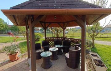 A kertben megépített pergola biztosítja a családi, baráti összejövetelek helyszínét, csodaszép parkosított udvarral, különleges virágzó cserjékkel.