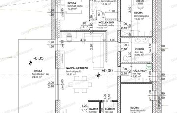 - előtér, nappali-konyha-étkező, kamra, közlekedő, 4 szoba, fürdő, háztartási helyiség + 8,91nm terasz + 4,27nm kerti tároló