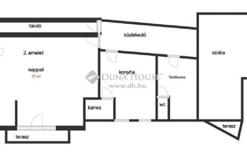 A garázs melletti kapun belépve lépcsőn mehetünk fel a kertbe, ahonnan a 88 m²-es pince/szuterén nyílik (félig a talajszint fölött, félig a föld alatt, ahogyan a hegy emelkedik). Itt egy különbejáratú lakás is kialakítható! A következő szinten 2 vendégszobát találunk, előttük a 46 m²-es terasz. Ezen a szinten van még egy fürdőszoba, külön WC és egy gardrób/raktár. A következő szint az 1. lakás: nagy nappali, két dolgozószoba (az egyik a Remete-szurdokra néző terasszal, a másik a Pilisre néző erkéllyel), panorámás hálószoba, tágas kamra, panorámás konyha terasszal, fürdőszoba WC-vel, + egy külön WC. Belső lépcsőház visz a következő szintre, a tetőtérbe. Itt található a 2. lakás: 98 m²-es, összkomfortos, kétszobás: itt található a panorámás, erkélyes hálószoba, valamint a panorámás, két erkélyes nappali, egy tágas kamra, konyha, fürdőszoba és WC.