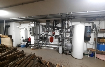 A ház alatt kialakított pincében található a kazánház. A fűtést kondenzációs gázkazán és faelgázosító kazán működteti padlófűtéssel és radiátorokon keresztül. A megújuló energiát hasznosító rendszerek (napelem és napkollektor) és a többlépcsős fűtési megoldások hosszú távon is biztonságos és költséghatékony működést garantálnak.