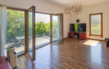 A nappali közvetlen kapcsolatban áll a 38 m²-es terasszal és a kerttel, amely kiváló helyszín családi reggelikhez vagy baráti összejövetelekhez.