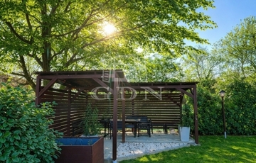 A házhoz tartozó parkosított kert és fedett terasz kiváló helyszínt biztosít pihenéshez, családi programokhoz vagy baráti összejövetelekhez.