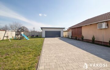 Az elektromos garázskapuval felszerelt, 35 m²-es dupla garázsban kényelmesen elfér két autó is, az udvar nagy része Frühwald térburkolattal burkolt, de maradt hely a kerti játszótérnek, illetve zöldfelületnek is.