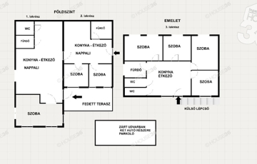 Földszinten fedett terasz és két lakrész, míg az emeleten egy lakórész található. Udvarban 2-3 autó számára parkolási lehetőség.