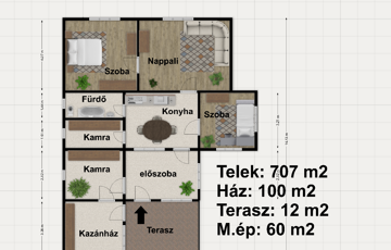 A ház alapterülete és helyiségeinek elosztása alapján, egy felújítás alkalmával, amerikai konyhás nappali + 3 külön nyíló hálószoba alakítható ki.