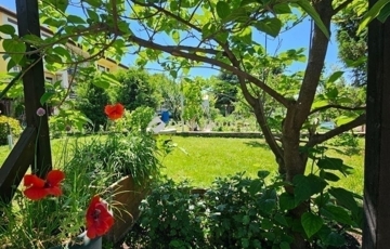A lakáshoz körbekerített 115 nm-es telek tartozik, ahol szaletli és sütögető is található.