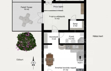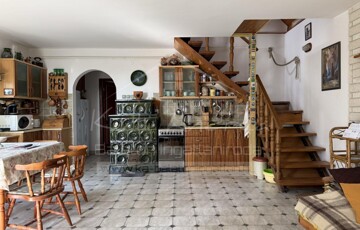 A földszinten található egy amerikai konyhás nappali, ahol egy hangulatos cserépkályha is helyet kapott, valamint egy fürdőszoba.