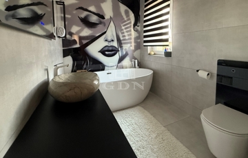 A ház téglaépítésű, szigetelt, tágas, világos, körbe napozott, minőségi anyagokból készült. A burkolatokat tekintve a szobákban magas minőségű laminált padló, a nappaliban a közlekedőben, valamint a konyhában és a vizes helyiségekben jó minőségű járólap található. A nyílászárók 3 rétegű műanyagból készültek, hőszigetelt üvegezéssel, rajtuk redőny és szúnyogháló található. A házban klíma kiépítésre került. A 20m2-es terasz, kényelmes pihenést biztosít. Az utcai kapu elektromosan nyitható. A telek örökzöldekkel, dísznövényekkel parkosított, pihenő terasz, gyermekjátszótér, és egy 27m2-es szauna/konditerem kiépített zuhanyzóval, gépészettel, valamint egy jakuzzi található benne.