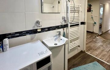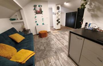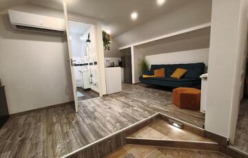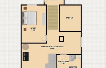 Emelet: 1 szoba, amerikai konyhás nappali, zuhanyzós fürdőszoba + wc.