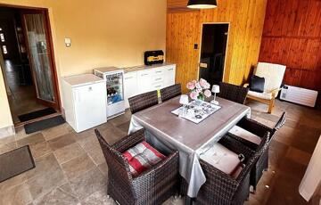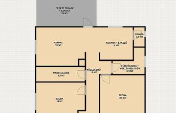 Földszint: 2 szoba, amerikai konyhás nappali, amiből egy fedett teraszra lehet kimenni, ahol egy 6 személyes szauna is található, kádas fürdőszoba + wc, közlekedő, pincelejáró.