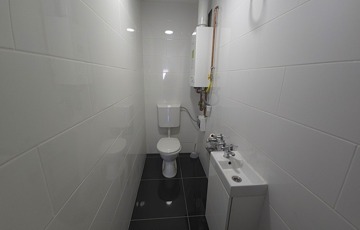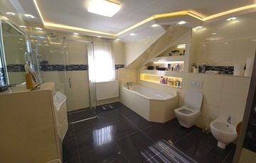 A fenti fürdőszoba kádas és zuhanyzós kialakítású, piszoárral és beépített szaunával, a wellnes-élmény otthon is adott.