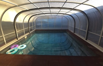 A kert központi eleme a nagy, vízforgatós, hidromasszázsos medence, amely fűtő és hűtő így egész évben élvezhető.