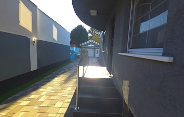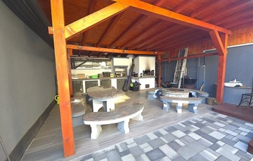 Innen nyílik a hangulatos első terasz, míg hátul helyezkedik el a garázs WC-vel és mosdóval, valamint a kerti sütögető, grillező és a kemence rész.