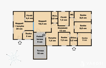 A ház két különálló lakóegységből áll. Az első egységben nappali, konyha, 4 hálószoba, fürdő, WC kapott helyet 90 négyzetméteren. A második lakóegységben, ami a garázs beépítésével készült, konyha, nappali, fürdő és egy félszoba készült a 30 négyzetméteren. A házhoz tartozik egy fedett és egy nyitott terasz is, ami szintén árnyékolható egy kitekerhető napellenzővel.
