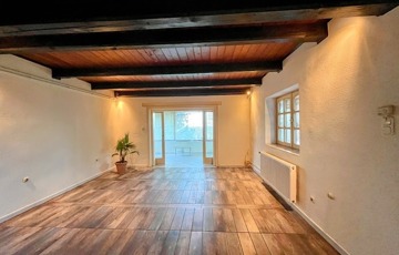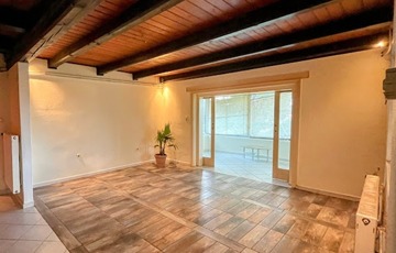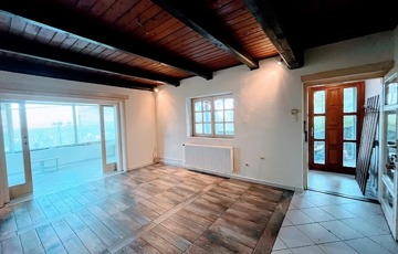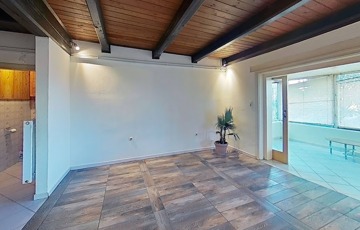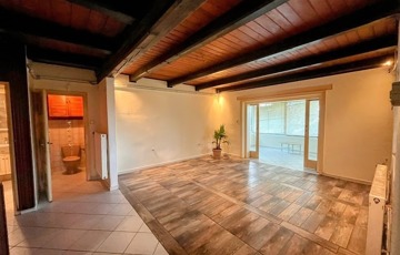 Az alsó szinten, nagy fedett terasz, nappali (vörösfenyő gerendákkal), konyha, külön wc, zuhanyzós fürdőszoba, étkező. (hidegburkolatok)