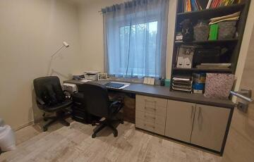 A földszinten tágas, napfényes amerikai konyhás nappali, dolgozószoba, fürdőszoba, külön WC, előszoba és egy hangulatos, fedett terasz található.