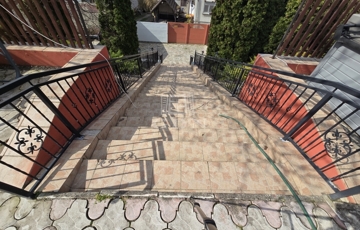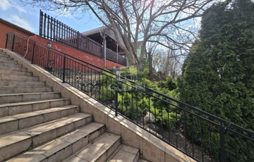 A felső és alsó udvarrészt egy hosszabb, karakteres lépcsősor köti össze, amely egy zöld, fásított, virágos kertszakaszon halad keresztül, különleges, szinte park jellegű átmenetet képezve a két tér között.