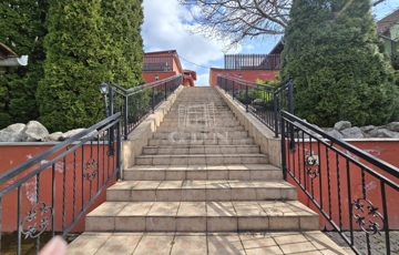A felső szinten elhelyezkedő ház és az első udvar egy kiemelt, magasabb ponton található. Ez a tér teljes egészében térkövezett egészen a garázsig, kiegészítve egy igényesen kialakított műfüves résszel, valamint két hangulatos kiülővel – köztük egy tágas, fedett, családi és baráti összejövetelekre is ideális térrel. Itt kapott helyet a garázs, valamint a jakuzzi is, amely tovább emeli az ingatlan komfortját.