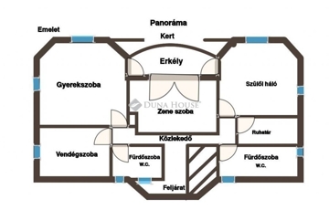 A felső szinten, a földszinti kialakításhoz hasonlóan a központi térben egy közösségi tér, zeneszoba, tőle balra a gyerekszoba és jobbra a szülői hálószoba. Mindhárom szobából kijárat a kb. 12 nm-es DNY-i tájolású, 180 fokos panorámával rendelkező erkélyre. A szülői hálóhoz kapcsolódik egy gardróbszoba és egy kádas fürdőszoba. A szinten található még egy további vendégszoba, saját tusolós fürdőszoba W.C.-vel.