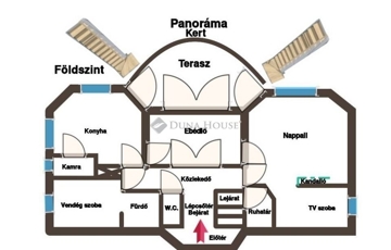 A földszinten az előszobából, külön is nyílik minden helyiség, a bal és a jobb oldali helyiségek és a külső formák tükörképei egymásnak. A ház központi részén a családi ebédlő, amelyből egyik irányba a konyha-kamra, a másik oldalon a családi nappali és TV szoba, amelyet hangulatos kandalló választ el egymástól. Mindhárom térből kiléphetünk a napos és panorámás teraszra, ahonnan csodálhatjuk az elénk táruló természetvédelmi területet, a kilátókat és akár a naplementét. Ezen a szinten található még egy dolgozó/vendégszoba és ehhez közvetlenül kapcsolódóan egy fürdőszoba W.C.-vel.