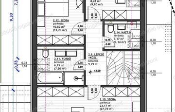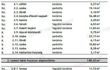 - Tetőtér: 3 szoba (az egyik kettéosztható), közlekedő, fürdő, háztartási helyiség.