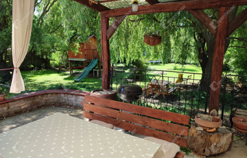 a telek végén patak csörgedezik, amely szinte erdei hangulatot teremt