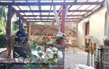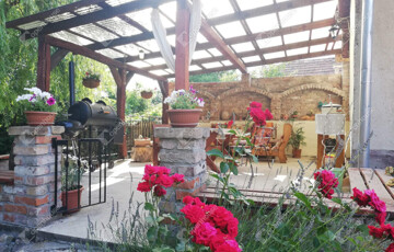 A nappaliból nyílik egy gyönyörű fedett terasz, amely régi, címeres téglából készült, autentikus rusztikus hangulatot teremtve. Ez a stílus természetes, történelmi karaktert kölcsönöz a kertnek, amely tökéletesen illeszkedik a vidéki környezethez.