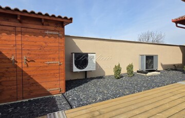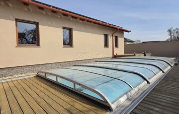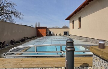 - 8x4 m-es épített sós vízű, automata működésű medence, 12 KW-os hőszivattyús fűtéssel, motoros fedéssel, fa szerkezetű gépészeti házzal, automata PH ellenőrző adagolóval és medencetöltéssel
