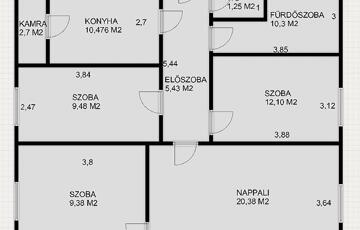 Konyha, 2+ 2 félszoba, fürdőszoba, kamra, mellékhelyiség, pince, padlás került kialakításra.
