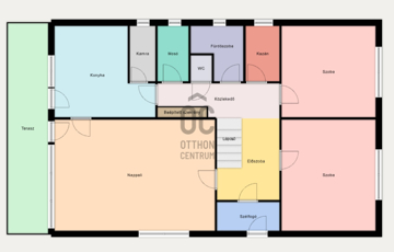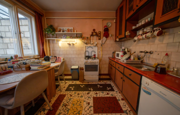 A földszinten előszoba, három különálló szoba, konyha, spájz, kádas fürdőszoba, külön WC és kazánház található.
