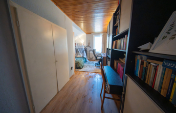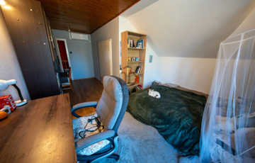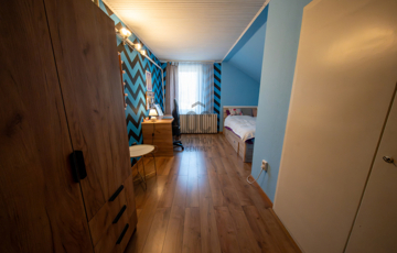 Az emeleten egy előtér, három gardróbos szoba, egy félszoba, kádas fürdőszoba, külön WC kézmosóval és egy erkély kapott helyet.