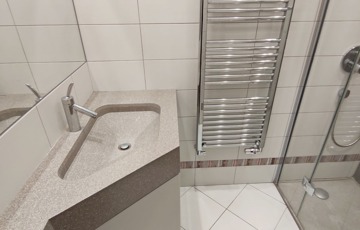 Innen kilépve a zárt lépcsőn felfelé haladva a tetőtérben kapott helyet a 34 nm-es gépesített, elektromos főzőlapos, modern bútorozott, amerikai konyhás, klímás nappali, a konyhai résznél járólappal burkolt, ezen kívül itt is padlószőnyeg szolgálja a komfort érzetet, innen nyílik a 3,6 nm-es loggia ahol napozni, kávézni lehet reggelente, plusz még ebben a légtérben, egy 24,30 nm-es társalgó-nappali szoba került kialakításra, amiből egy 2,7 nm-es dolgozószoba nyílik, mellette pedig a zuhanyzós fürdőszoba található, a külön nyíló toalettel. Itt is kapott helyet egy 2,9 nm-es tároló amiben a mindennapi főzéshez szükséges dolgokat lehet tárolni.