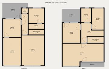 • Emelet: Két különnyíló hálószoba, egy hatalmas üvegfelületekkel rendelkező, világos nappali, 2 erkély és egy fürdőszoba.