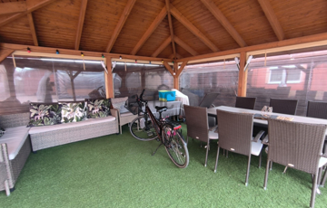 A térkövezett udvarban található a nagy méretű, téliesíthető filagória, amelyet a vételár tartalmaz.