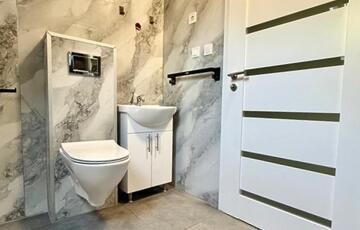 Az alsó szinten konyha, 2 szoba, egy fürdő és nappali kapott helyet, ahonnan a 30 m²-es terasz nyílik.
