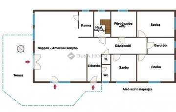 Az ingatlan földszint + beépített tetőtér kilakítással rendelkezik. Alsó szintjén egy tágas (közel 40m2-es) amerikai konyhás, teraszkapcsolatos nappaliszoba, 3 különnyíló hálószoba, egy fürdőszoba+wc, egy külön wc, egy háztartási helyiség, egy előszoba, közlekedő továbbá tároláshoz praktikusan egy tágas kamra, egy gardrób, és egy kisebb tárolóhelyiség kaptak helyet. A felső szinten egy nettó 30m2-es, egy légterű, tetőtéri szoba található. Az ingatlan minden helyisége kifejezetten jó fényviszonyú, a jól átgondolt elrendezésnek köszönhetően kiválóan berendezhető. A lakótérből a nappali irányában kilépve egy 36m2-es, fedett teraszra érkezünk, mely kialakításában kapcsolódik a medencéhez, és a sütögetéshez is ideális kerti pavilonhoz.